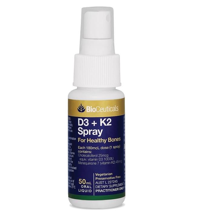 Vitamin D3 and vitamin K2 are combined in a convenient and high strength spray to assist in the maintenance of strong healthy bones, immune function and healthy blood coagulation.