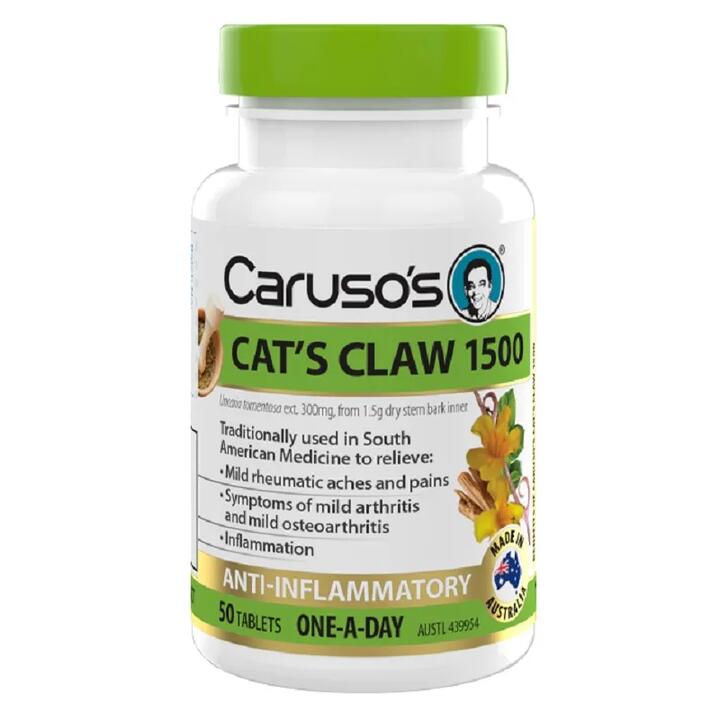 Caruso’s Cat’s Claw 1500 is a one-a-day herbal tablet for the relief of inflammation. Cat’s Claw is traditionally used in South American medicine to reduce and relieve the symptoms of mild arthritis, mild osteoarthritis and mild rheumatic aches and pains.