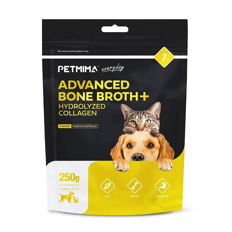 Advanced Bone Broth + Hydrolysed Collagen is designed to assist pets with joint pain, difficulty in movement, and recovery from illness. But it's not just for those showing symptoms; it's a proactive step for preventative health. Packed with hydrolysed bovine collagen and beef bone broth, these nutrients are crucial during times of illness, recovery, and to mitigate age-related joint & digestive deterioration. It's comprehensive care for your super-pet, both as a remedy and a preventive measure.