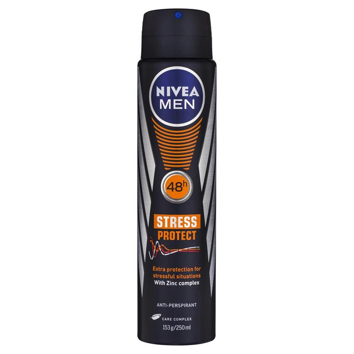 NIVEA MEN Stress Protect Anti-Perspirant Aerosol Deodorant contains powerful 'stress protect' actives and zinc complex, formulated to provide you with protection against sweat and odour. Stress Protect provides you with 48 hours of extra protection when you need it - so you can embrace those stressful situations in your everyday life. NIVEA MEN Stress Protect Anti-Perspirant Deodorant is scientifically proven to protect against emotional sweating. Its unique antibacterial formula combines 'stress protect' actives and a zinc complex to give you reliable antiperspirant protection against sweat and body odour.