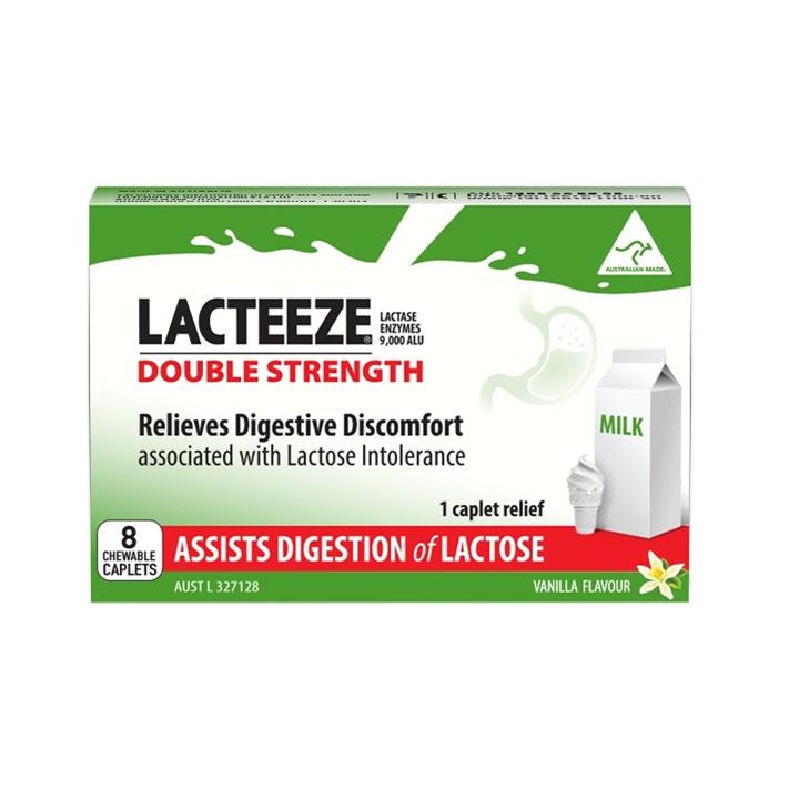 Lactose intolerance occurs when the body does not produce enough lactase enzymes to digest the lactose consumed in dairy products, leading to digestive pain and discomfort. Lacteez Ultra Caplet X 8 naturally supplements the body's supply of lactase enzymes, allowing dairy to be enjoyed again. Simply chew or swallow 1 Lacteeze Ultra caplet prior to consuming dairy. Benefits of New Lacteeze Ultra: New double strength formula allows 1 caplet relief, New vanilla flavour is low in salicylates, and NEW caplet is easy to swallow or chew. New 8 caplet trial pack is perfect for trialling the product, or for a handbag pack.