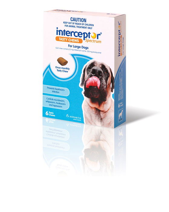 INTERCEPTOR Spectrum is a convenient and simple way to protect your dog against heartworm and the major intestinal worms. One delicious beefy flavoured tablet once a month all year round is all it takes to give your dog a lifetime of protection against even the most dangerous worms.