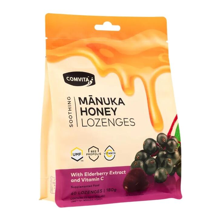 Comvita Manuka Honey Lozenges combine the unique qualities of New Zealand UMF 10+ Manuka honey, Vitamin C, Propolis and Elderberry extract to provide a soothing taste anytime of day.