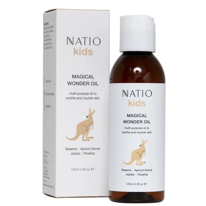 Gently massage the day away with this nourishing multi-purpose essential oil for kids. Perfect on its own, the fragrance-free blend of Sesame, Apricot Kernel, Jojoba and Rosehip oils soothes and nourishes young skin. Combined with Natio Kids Essential Oil Blends, Magical Wonder Oil supports an extra restorative massage with aromatherapy benefits. Suitable for toddlers through to tweens.