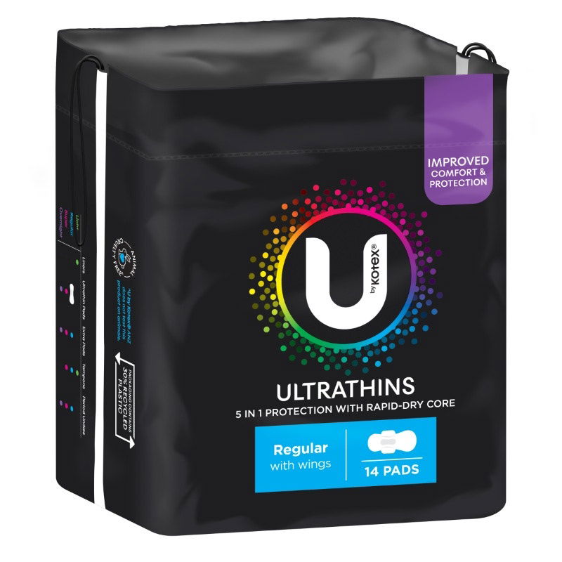 U by Kotex(R) Ultrathin Regular Pads with wings have with Rapid-Dry Core for freshness and an ultra-soft top layer for comfort. Their discreet, ultra-thin design feels like wearing nothing at all.