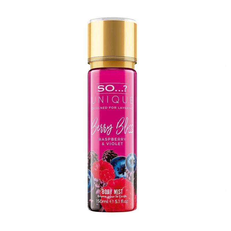 Our So…? Unique Berry Bliss Body Mist (150ml) features a burst of fruity red berry notes with sweet violet and vanilla to boost your mood.