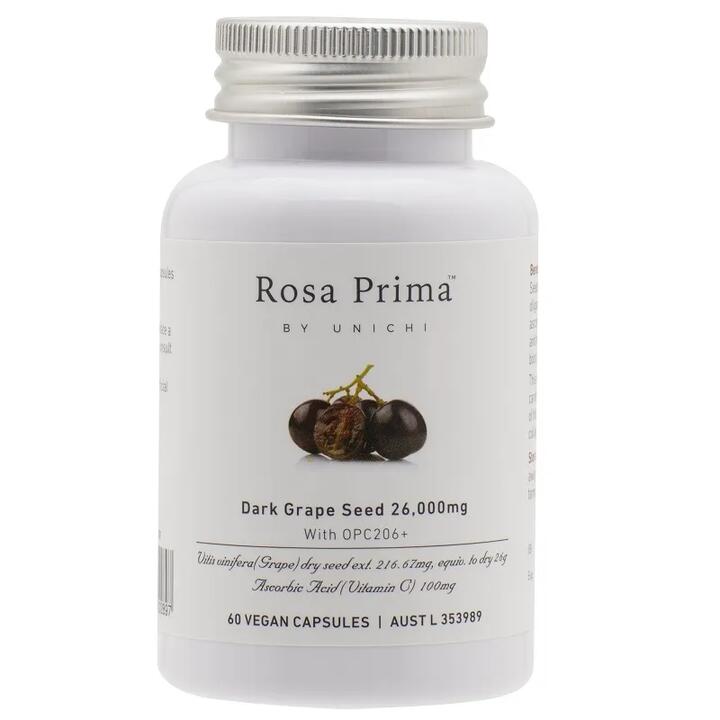 Rosa Prima’s Dark Grape Seed 26,000mg with OPC206+ contains oligomeric proanthocyanidins (OPCs) and ascorbic acid, which are great antioxidants and help reduce free radical damage to body cells. This product also helps with maintaining cardiovascular system health, the health of blood vessels and capillaries and collagen formation.