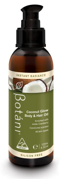 Botani Coconut Glow Body & Hair Oil: light-weight and non-greasy, a nutritious treatment enriched with an exclusive blend of plant actives that provide vital protection from harsh environmental elements and assist to strengthen and restore both skin and hair.
