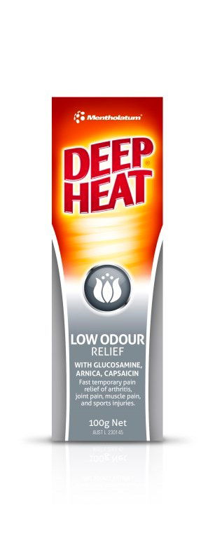 Low odour formulation.Deep Heat's greaseless, stainless formulation temporarily relieves the pain of fibrositis, lumbago, muscular aches and strains.