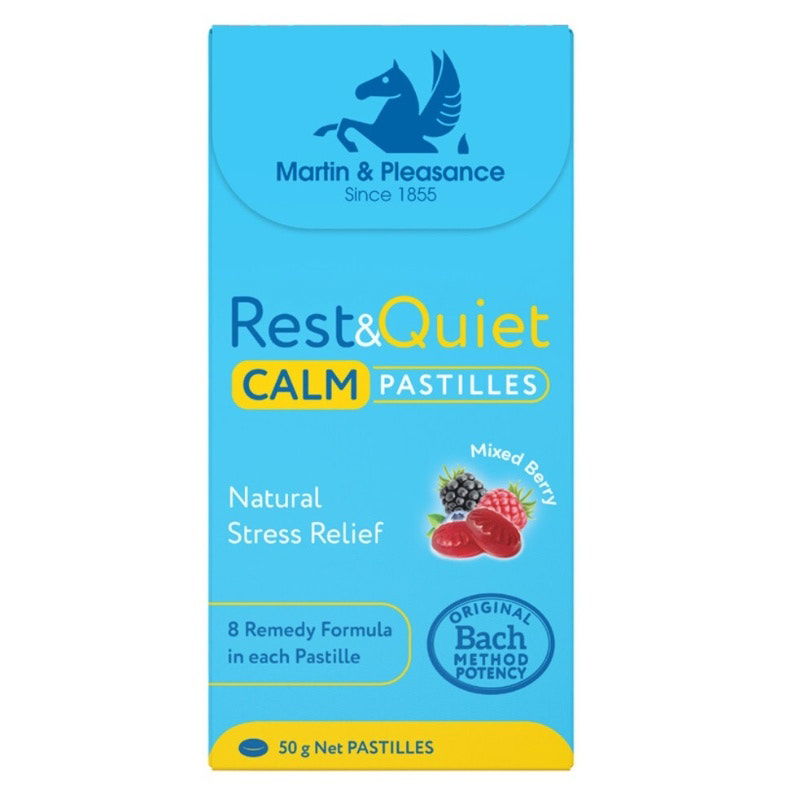 Rest&Quiet Calm Pastilles contains 4 drops of the Calm formula of the 8 remedy formula in each pastille. Made with Dr Bach’s original formulation (Cherry Plum, Clematis, Impatiens, Rock Rose & Star of Bethlehem) with an additional 3 remedies (Aspen, Mimulus & White Chestnut) to give the emotional support to overcome our daily stressors that we now face in our ever-changing world.