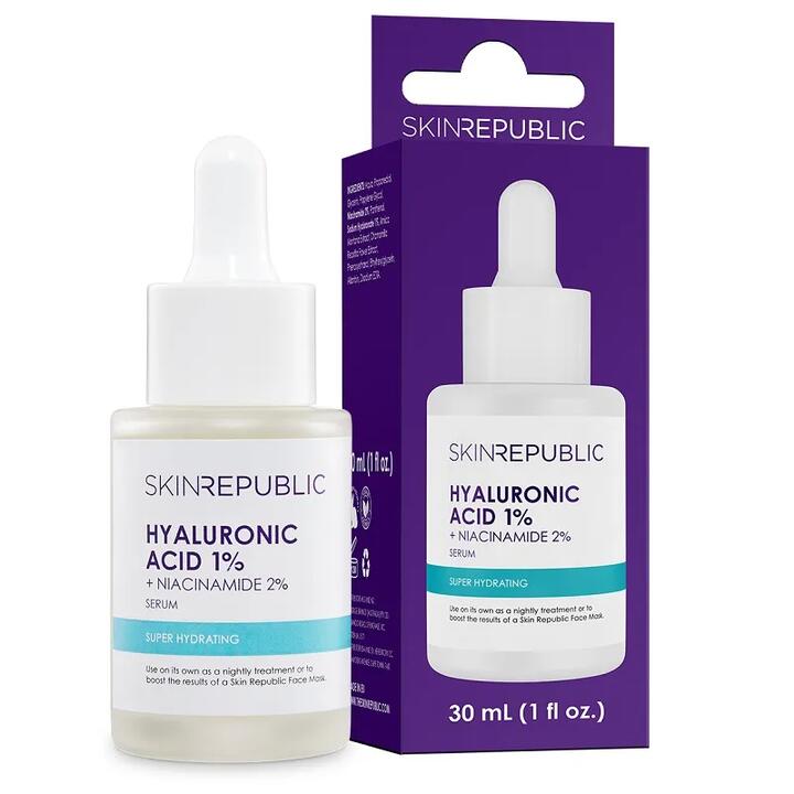 Skin Republic Hyaluronic Acid 1% + Niacinamide 2% Serum 30ml Provides long-lasting moisture, and is infused with 1% hyaluronic acid deeply hydrates dry skin.