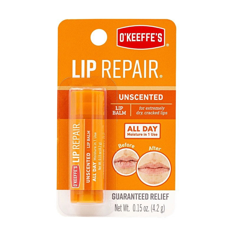 For an intensively conditioning lip balm that keeps chapped lips at bay, O'Keeffe's Lip Repair is the perfect choice. This highly effective formula relieves, helps repair and moisturises dry lips to leave them feeling soft, smooth, and healthy all day long. Offering lasting hydration for up to 24 hours, O'Keeffe's Lip Repair is clinically proven to work with just one application. That’s right—no more having to apply and reapply all day, every day. It even lasts throughout eating and drinking!