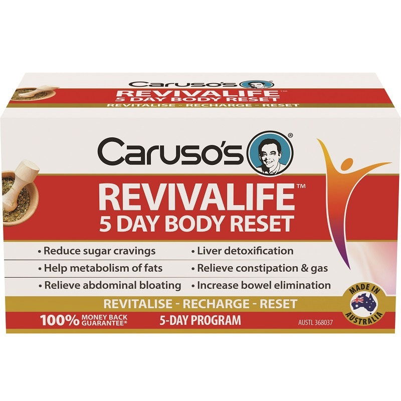 Caruso’s Revivalife 5 Day Body Reset carton includes 3 product formulas Caruso's CraveLESS, Caruso's Fluid Away & Caruso's Bowel Clear containing a total of 16 herbal and nutritional ingredients. When used together in conjunction with the Body Reset Diet (Scan QR code within the carton) they work simultaneously to revitalise, recharge and reset your body.