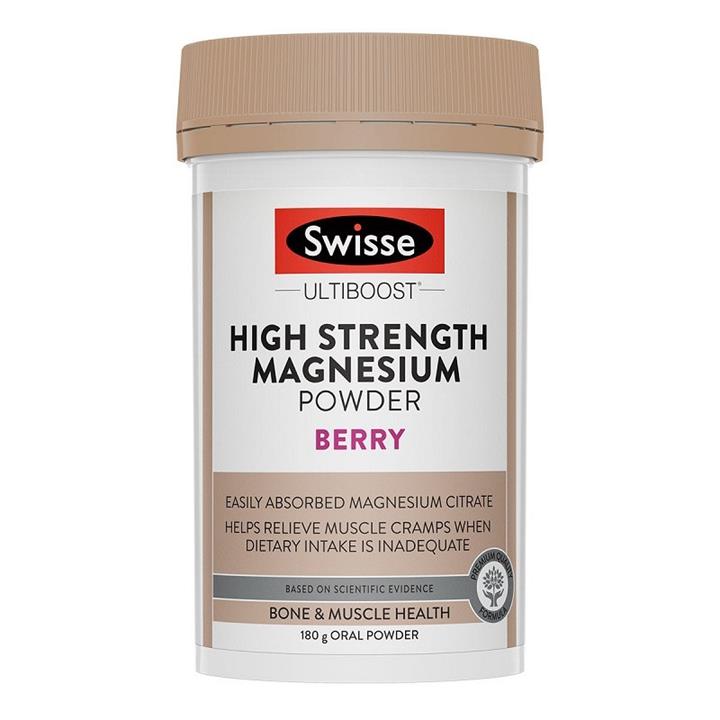 Support muscle function and relaxation with a high-strength dose of magnesium. Swisse Ultiboost High Strength Magnesium Powder is a premium quality formula that contains two forms of magnesium to support muscle health and help relieve muscle cramps and mild muscle spasms when dietary intake is inadequate. It also supports nervous system health, relieves tiredness, and supports energy production. This convenient powder, which comes in a delicious natural berry flavour, is easily absorbed and provides an option for individuals with an active lifestyle who want an alternative format to tablets and capsules.