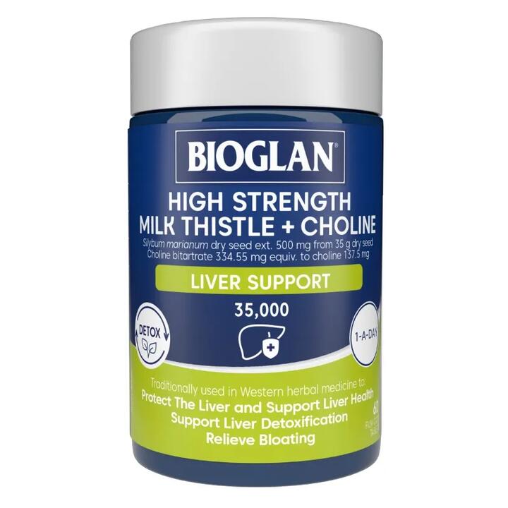Bioglan High Strength Milk Thistle + Choline combines the detoxifying power of Milk Thistle with the essential nutrient Choline. Formulated in a high strength, convenient one-a-day dose.