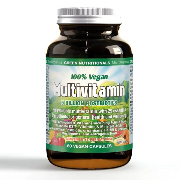 A bioavailable, 1-a-day, 100% Vegan Multivitamin featuring 29 essential ingredients, including activated B-Vitamins (with folinic acid and activated B12), D3, vital vitamins and minerals, medicinal mushrooms, and 5 BILLION postbiotics. Formulated to support gut health, boost energy, strengthen immunity, and promote overall vitality.