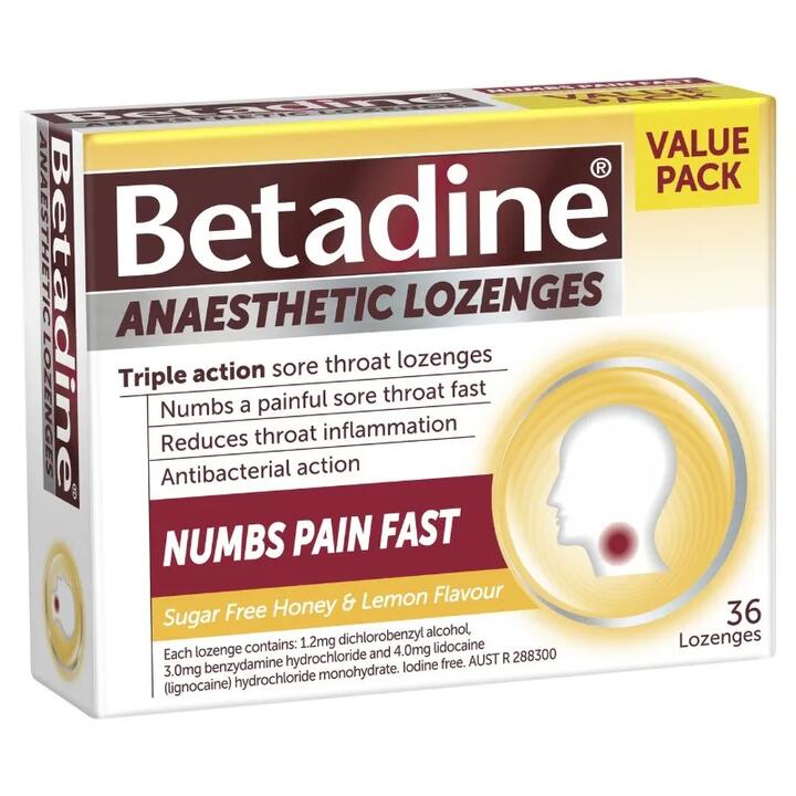 Betadine Anaesthetic Lozenges are recommended for the relief of symptoms associated with a sore throat. Reduces throat inflammation, relieves pain for fast effective relief of symptoms of a sore throat and helps kill bacteria that may cause a sore throat. Iodine free. Sugar free.