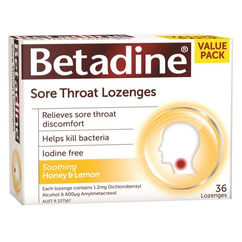 Betadine sore throat lozenges contain 2 antibacterial agents to help provide fast, soothing relief from the discomfort of sore throats, and helps kill bacteria that may cause a sore throat. Iodine free.
