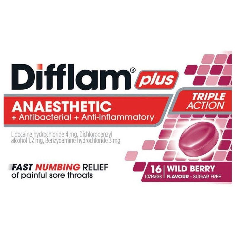Difflam Plus Anaesthetic Sore Throat Lozenges have a triple action antibacterial + anti-inflammatory + anaesthetic formula for fast numbing relief of a sore throat.