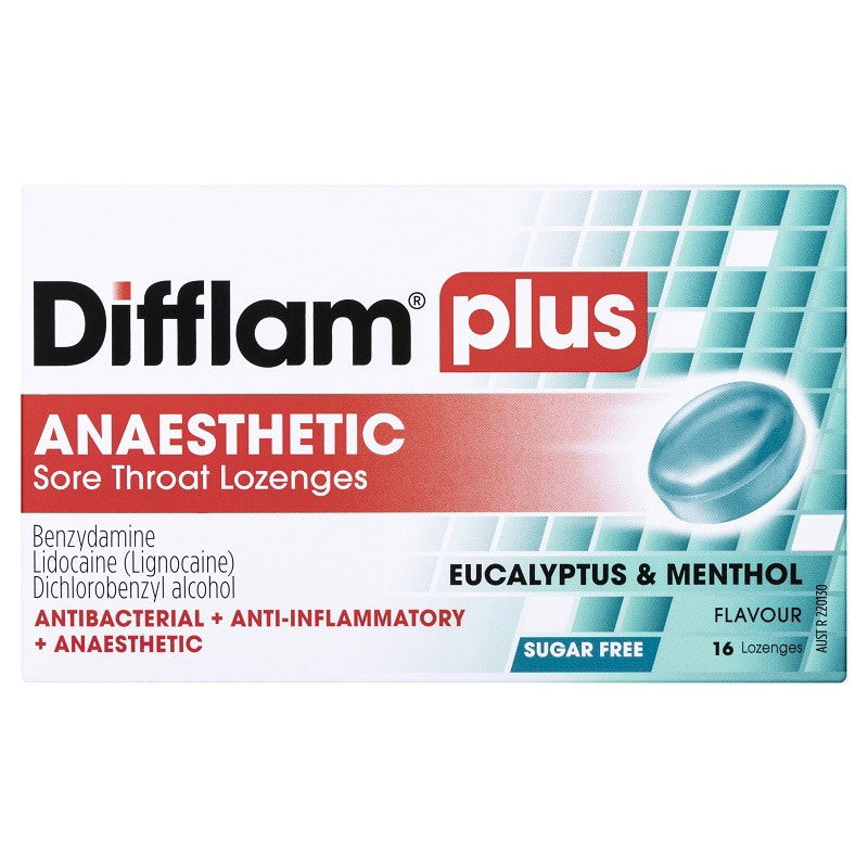 Difflam Plus Anaesthetic Sore Throat Lozenges have a triple-action antibacterial, anti-inflammatory, anaesthetic formula for fast numbing relief of a sore throat.