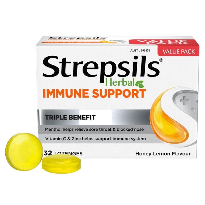 Strepsils Herbal Immune support lozenges are formulated with menthol for the temporary relief of sore throat and blocked nose. The addition of Vitamin C and Zinc helps support your immune system.