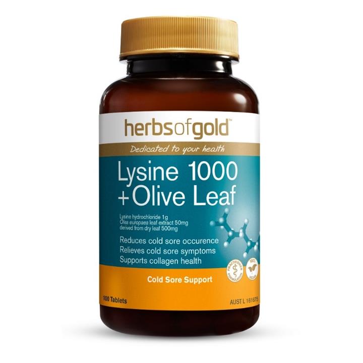 Herbs of Gold Lysine 1000 + Olive Leaf contains high-strength lysine to reduce symptoms of facial cold sores.