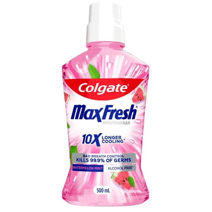 Experience a flavour explosion with Colgate Max Fresh Watermelon Mint Antibacterial Alcohol Free Fluoride Free Mouthwash. Provides a cooling sensation that lasts 10X longer than brushing alone. Kills up to 99.9% of germs and used twice daily provides 24/7 bad breath control for long lasting freshness, with watermelon mint flavour.