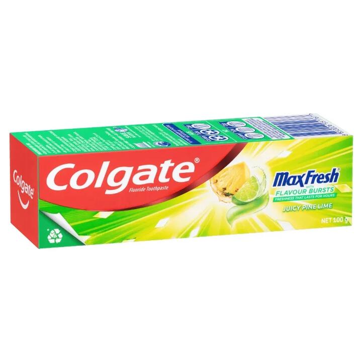 Experience a flavour explosion with Colgate Max Fresh Juicy Pine Lime + Fluoride Toothpaste. Not only does it fight cavities and freshen breath, it will delight your senses... making brushing feel more enjoyable! Freshness that lasts for hours.