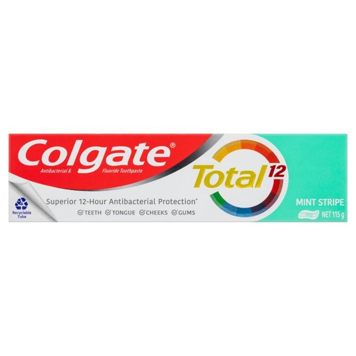 Colgate Total Mint Stripe Antibacterial Toothpaste, is a fluoride, multi benefit toothpaste. Suitable for daily use and reduces bacteria on teeth, tongue, cheeks and gums.