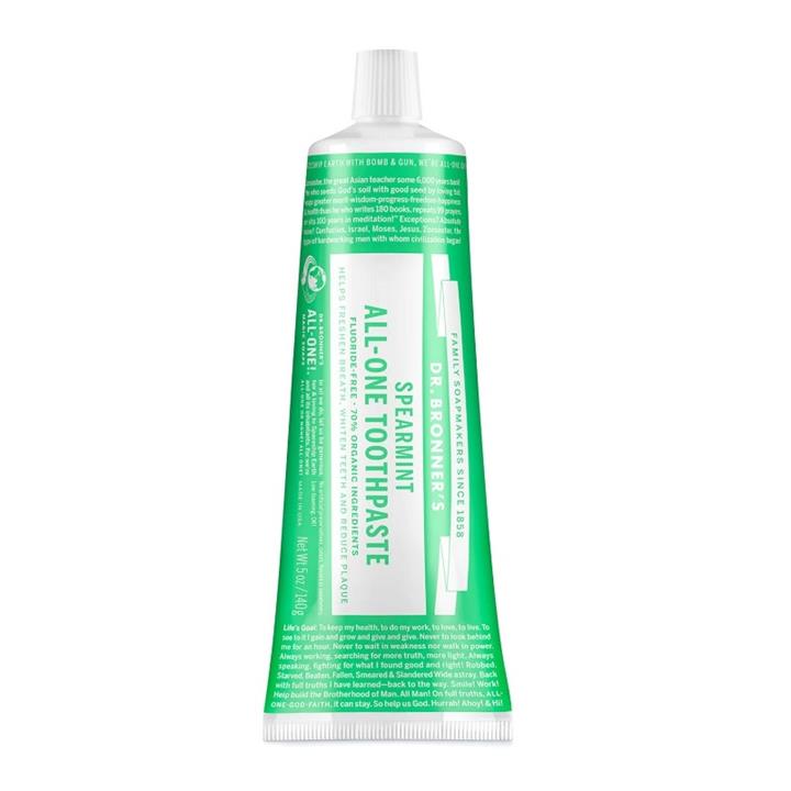 Dr. Bronner’s All-One Toothpaste now available in Spearmint! Made with organic spearmint oil to leave your mouth with a long-lasting mellow-minty-fresh-clean feeling. Our simple and effective formula is made with 70% organic ingredients you know and trust. Fluoride- & SLS-free, our low-foaming toothpaste uses organic menthol crystals to freshen breath naturally. Organic coconut flour & fair trade organic coconut oil helps to gently remove plaque and whiten teeth, while organic aloe helps soothe gums. Vegan & cruelty-free, with no artificial colors or flavors, carrageenan, preservatives, synthetic sweeteners or detergent foaming agents—none!