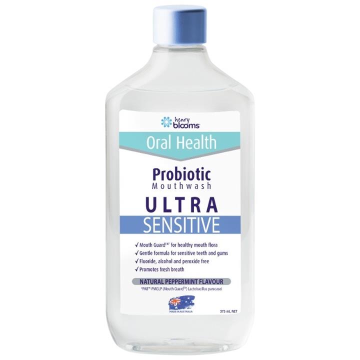 Henry Blooms Ultra-Sensitive Probiotic Mouthwash provides gentle mouth care with the addition of probiotic protection. The non-irritating formula is alcohol and peroxide free, making it suitable for sensitive mouths while providing cavity protection and a blast of long-lasting minty freshness.