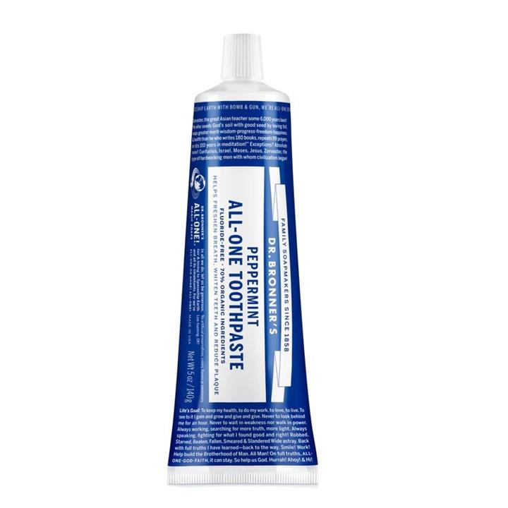 Dr. Bronner’s All-One Peppermint Toothpaste has a bold peppermint flavor from the organic peppermint oil and the organic menthol crystals that stimulates mouth and gums with a cool, crisp sensation. Our simple and effective formula is made with 70% organic ingredients you know and trust. Fluoride & SLS-free, our low-foaming toothpaste uses organic menthol crystals to freshen breath naturally. Organic coconut flour & fair trade organic coconut oil helps to gently remove plaque and whiten teeth, while organic aloe helps soothe gums. Vegan & cruelty-free, with no artificial colors or flavors, carrageenan, preservatives, synthetic sweeteners, or detergent foaming agents—none!