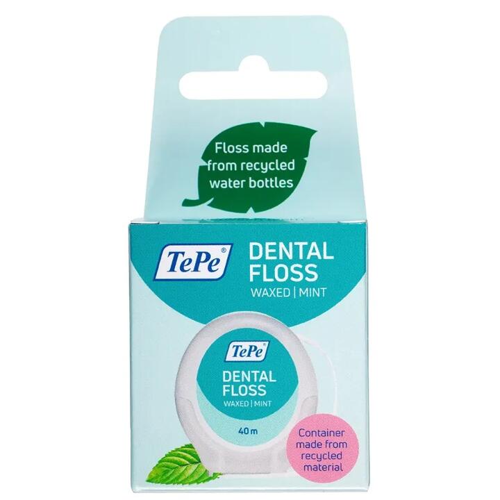 TePe Dental Floss is an expanding and strong dental floss that efficiently and gently removes plaque between teeth. The floss easily slides between teeth due to its coating in vegetable wax and avocado oil. The pfas free floss contains multiple threads which make for an increased cleaning surface. This efficient plaque remover is made from recycled water bottles which reduces the environmental impact. Daily use and the mild mint flavour will leave you feeling fresh, and keep teeth and gums clean and healthy. The TePe Dental Floss has been developed in close cooperation with dental experts.