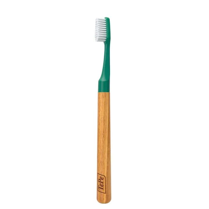 The TePe Choice is a sustainable, soft bristle toothbrush with a reusable wooden handle and three replaceable brush heads. The soft end-rounded filaments and tapered brush heads make for a gentle and efficient cleaning.