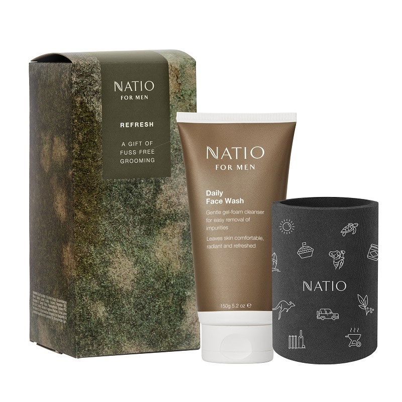 Refresh gift set includes a full size Natio For Men Daily Face Wash plus complimentary Natio drink holder, packaged in a Natio gift box.