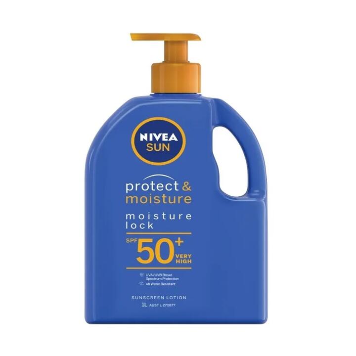 Nivea Sun Protect & Moisture Sunscreen Lotion SPF 50+ with UVA+UVB broad spectrum filters, vitamin E and panthenol.