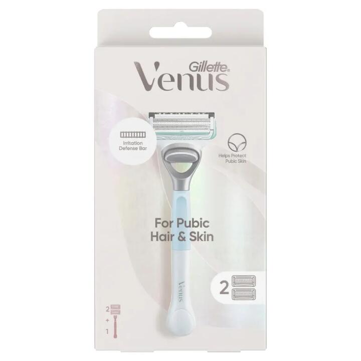 Gillette Venus's pubic hair and skin razor is specifically designed to help protect pubic skin from shave irritation. Its patented Irritation Defense Bar and optimally spaced blades allow the blades to cut hair while barely touching the skin. Also, the razor refills come equipped with a precision trimmer on the back of the blades to help with tricky areas.