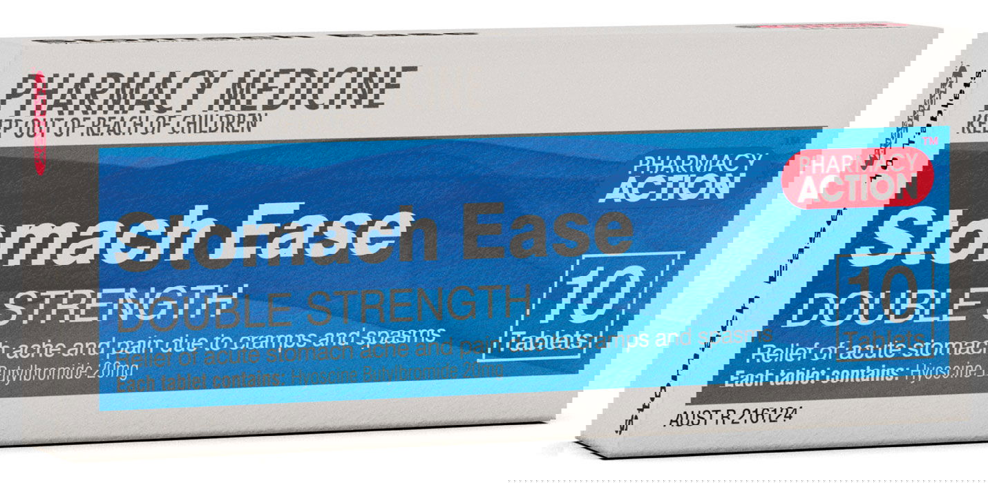 Pharmacy Action Stomach Ease Tab X 10 (Generic for Buscopan) contains a forte strength of hyoscine butylbromide, a substance derived from a species of the plant genus Duboisia.