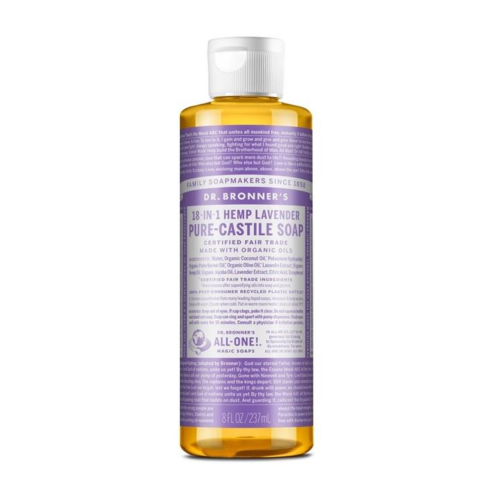 Scented with pure lavender and lavandin oils to calm the mind and soothe the body! Dr. Bronner's Pure-Castile Lavender Liquid Soap is concentrated, biodegradable, versatile, and effective. Made with organic and certified fair trade ingredients, packaged in a 100% post-consumer recycled bottle. All-One!