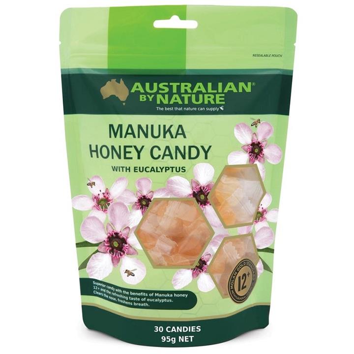 Australian by Nature Manuka & Eucalyptus candies are a refreshing and tasty treat, containing the goodness of Manuka Honey and Eucalyptus. With the natural sweetness and healing properties of Bio–Active Manuka Honey with a 12+ NPA rating, and the soothing effects of Eucalyptus Oil, these candies are effective in clearing your nose, soothing your throat and giving freshness to your breath. Individually sealed for optimum taste and freshness, the candies are available in bags of thirty or sixty.
