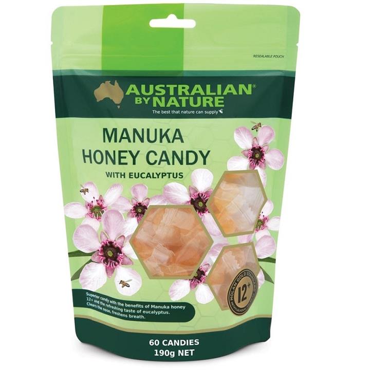 Australian by Nature Manuka & Eucalyptus candies are a refreshing and tasty treat, containing the goodness of Manuka Honey and Eucalyptus. With the natural sweetness and healing properties of Bio–Active Manuka Honey with a 12+ NPA rating, and the soothing effects of Eucalyptus Oil, these candies are effective in clearing your nose, soothing your throat and giving freshness to your breath. Individually sealed for optimum taste and freshness, the candies are available in bags of thirty or sixty.