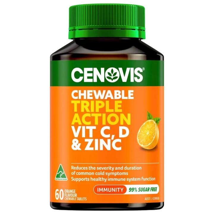 Cenovis Chewable Triple Action Vit C, D & Zinc comes in a great tasting, orange flavoured chewable tablet that is 99% sugar free.