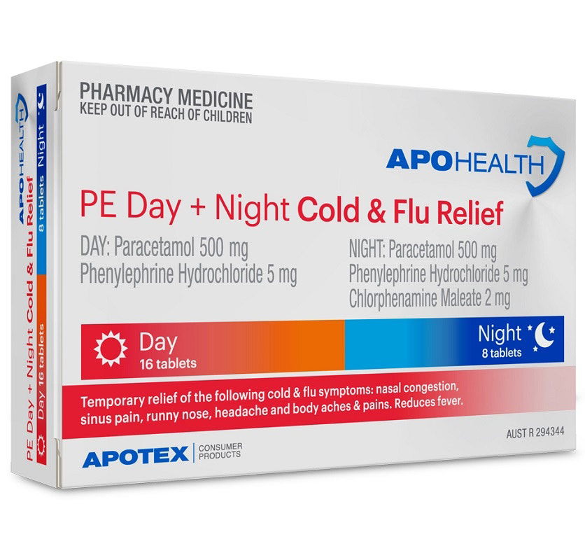 APOHEALTH PE Day + Night Cold & Flu Relief provides temporary relief of cold and flu symptoms including nasal congestion, sinus pain, runny nose, headache and body aches and pains. Also reduces fever.