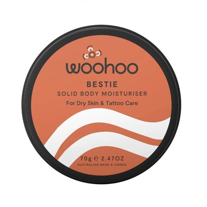 Woohoo Bestie Solid Body Moisturiser (Dry Skin & Tattoo Care) Tin 70g - These bars may look like a bar of soap but they're not - they're actually waterless moisturizers! Our Solid Moisturising Body Bars are a delicious mix of plant oils and butter to leave your skin soft, nourished, and deeply moisturized from tip to toe. They’re fabulous for revitalizing tattoo colours and smell aaah-mazing.