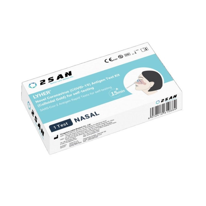 The LYHER antigen test is a single-use, in vitro (outside the body) test to aid in the diagnosis of SARS-CoV-2 infection in individuals with symptoms of COVID-19. The test uses specimens collected from your nasal cavity using a nasal swab to detect the presence of the nucleocapsid protein SARS-CoV-2 antigen (Ag). An immunoassay technique is used to detect antigens of COVID-19. The sample pad is coated with colloidal gold-bound antibodies. The quality control area is coated with goat anti-mouse Immunoglobulin G (IgG), and test area with anti-SARS-CoV-2 antibodies. If SARS-CoV-2 antigen is detected in specimen, the T line will become visibly coloured. The C line should always be coloured, or the test is not valid.