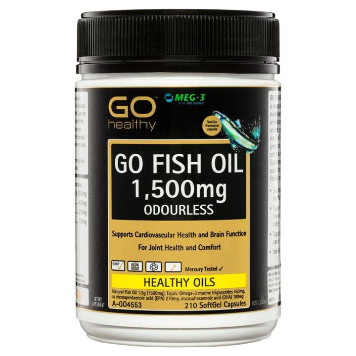 Go Healthy Go Fish Oil 1,500mg Odourless SoftGel Capsules support cardiovascular health and brain function and is for joint health and comfort.