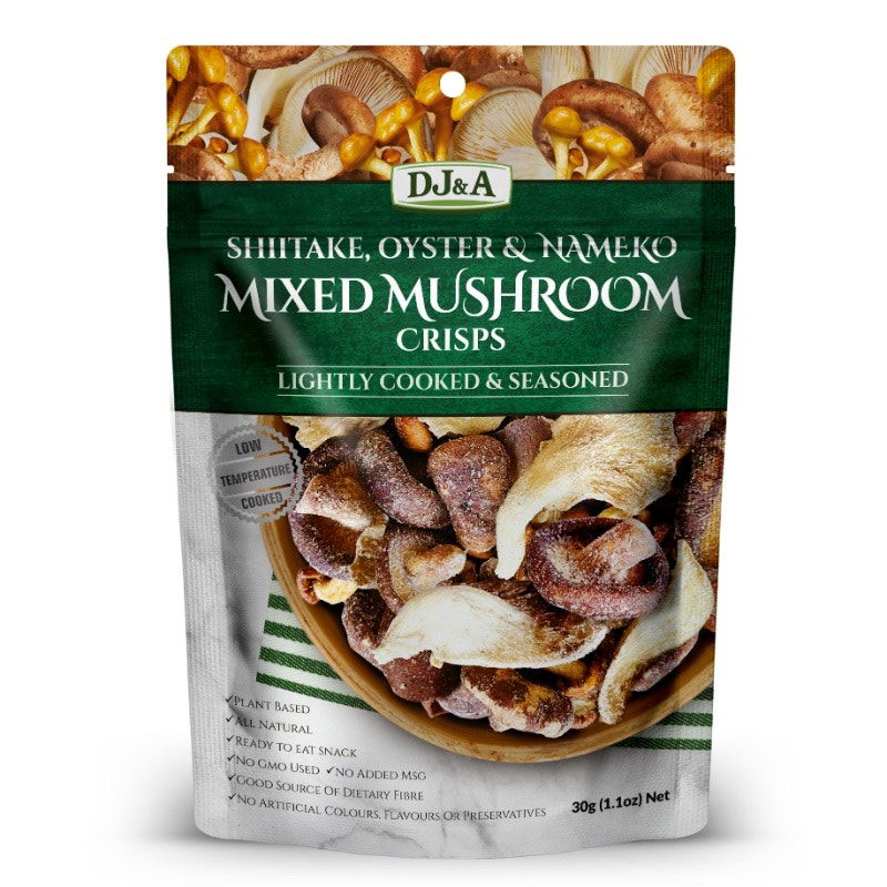Vacuum cooked shiitake, nameko and oyster mushroom chips with savoury mushroom flavour added. DJ&A Mixed Mushroom Crisps is a ready to eat snack that is all natural, plant based and a good source of dietary fibre. It contains no GMO ingredients, no added MSG and no artificial colours, flavours or preservatives.
