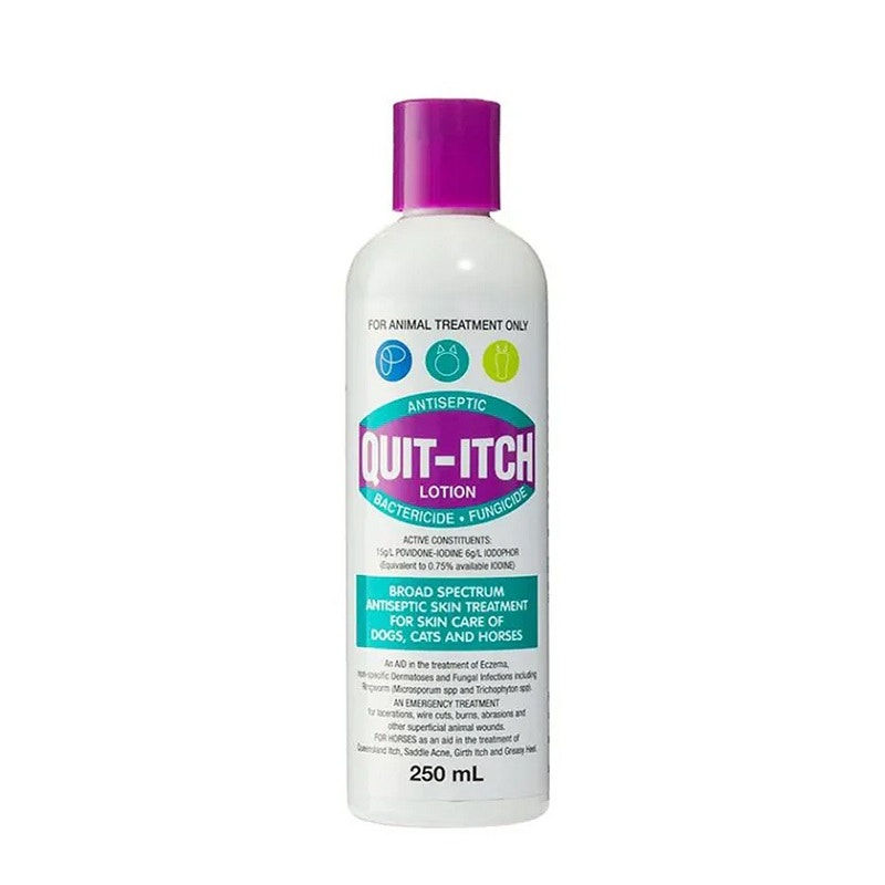 Works as a broad spectrum antiseptic skin treatment for skin care of dogs; cats and horses. Aids in the treatment of Eczema; Ringworm; Fungal Infections; Cuts; Burns; Qld Itch; Girth Itch and Greasy Heel. Quit-Itch lotion is a proven and trusted antiseptic bactericide and fungicide for treating various skin conditions on Dogs; Cats and Horses.