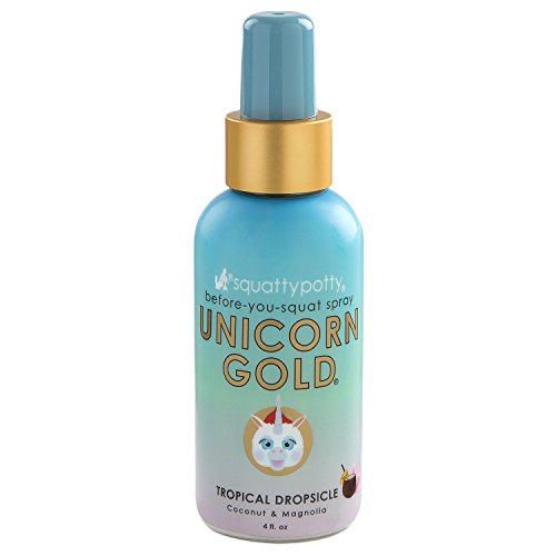 Unicorn Gold is for before you sit on the toilet. Created by Squatty Potty Unicorns. Let rip a few sprays into the toilet bowl before 'the event' and forget that bathroom stench forever. It stays trapped deep below the surface of the toilet water, never to surface again.