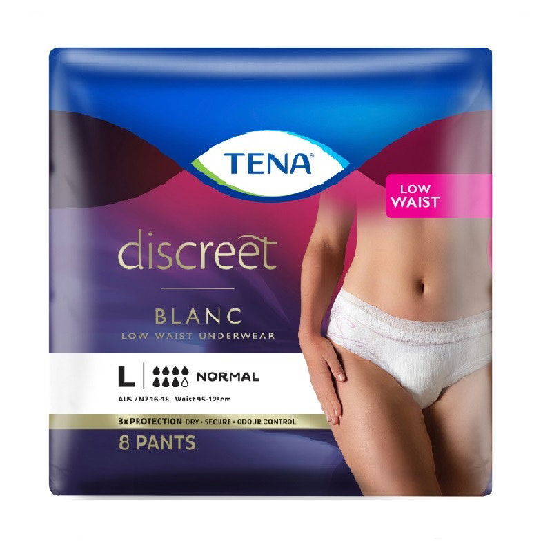 TENA Women’s Discreet Low Waist Blanc incontinence underwear have a stylish low waist design with micro-stretch fabric that make them look and feel just like regular underwear.